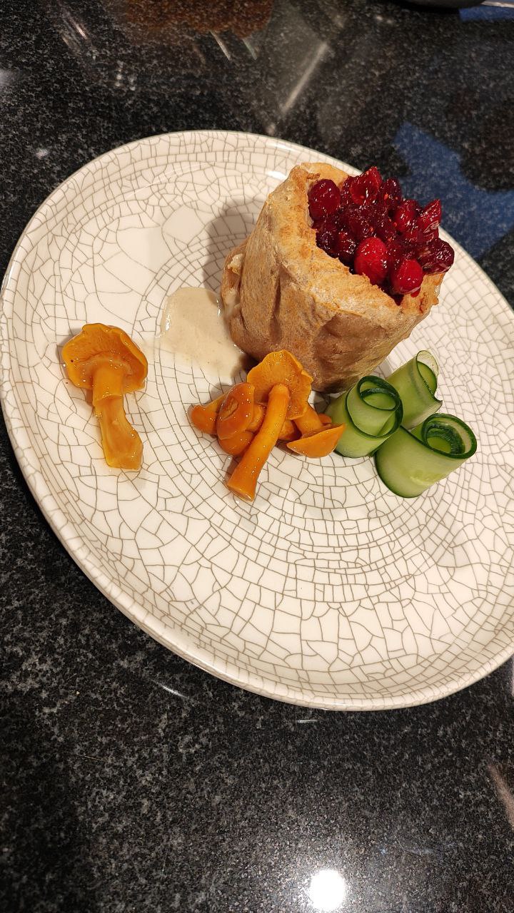 - Пирог русский с нутрией и белыми грибами. С соусом из клюквы и опятами маринованными.