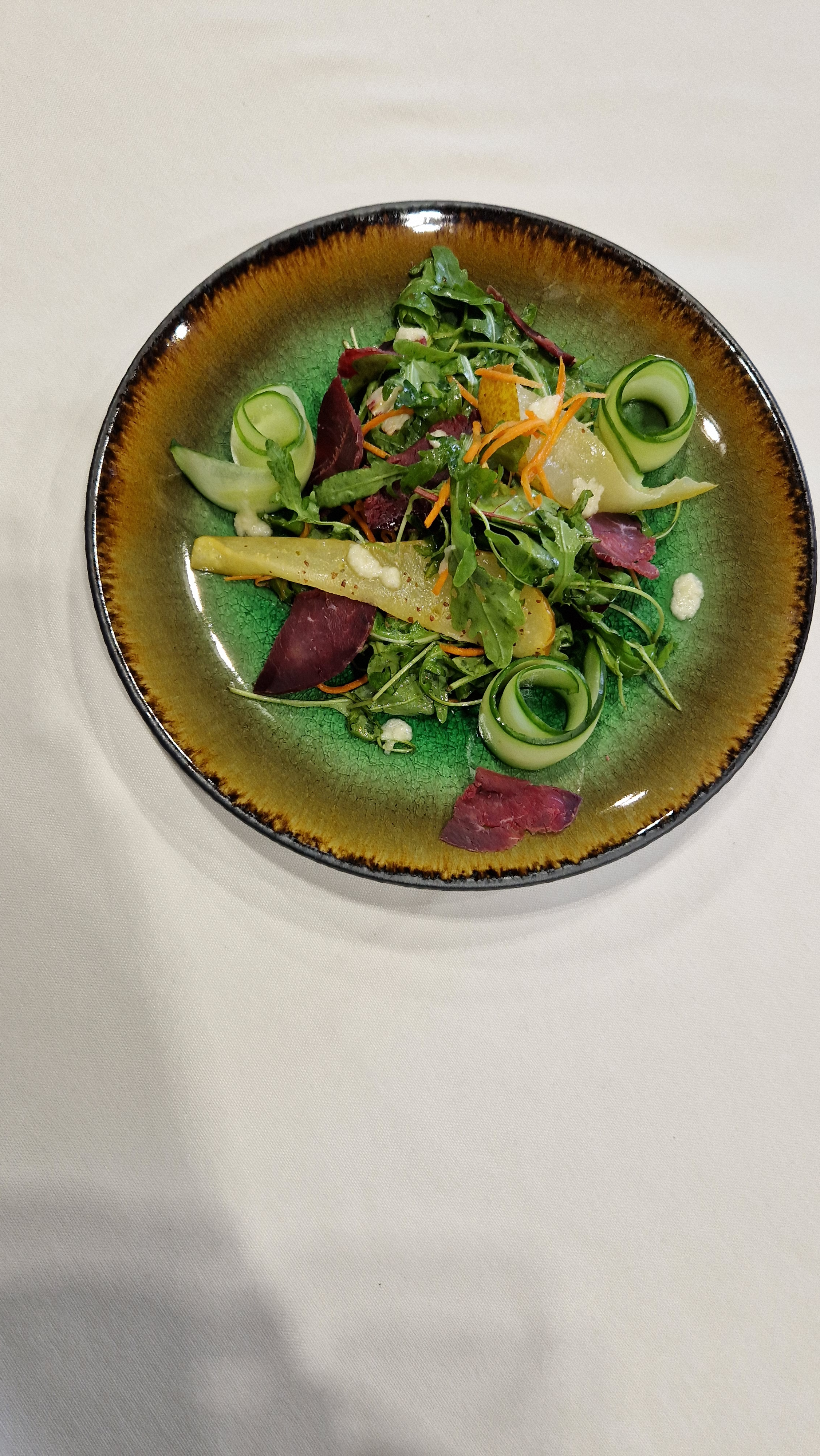 - Салат сезонный с томленной грушей, свежим огурцом и сыровяленным лосем.