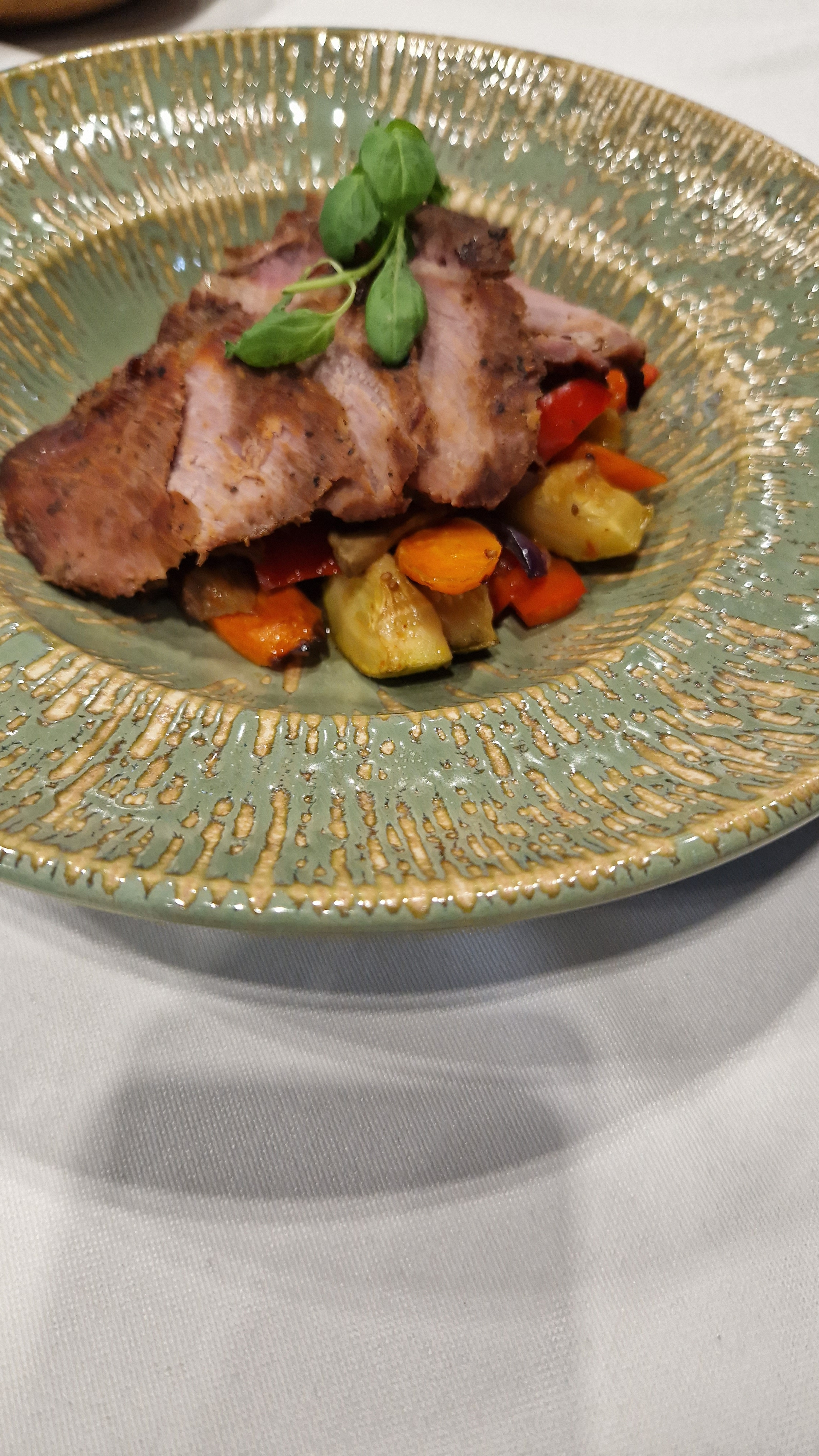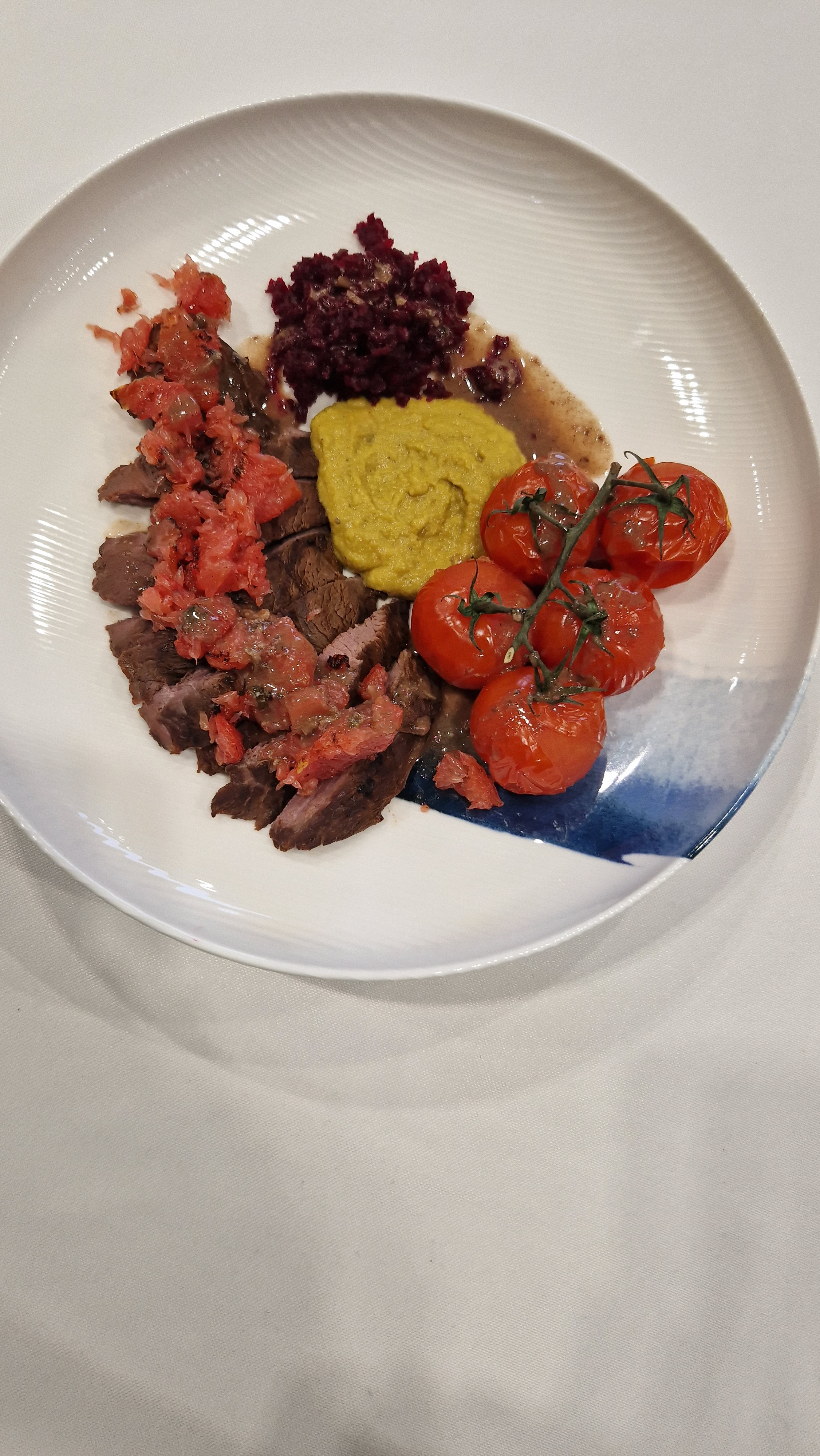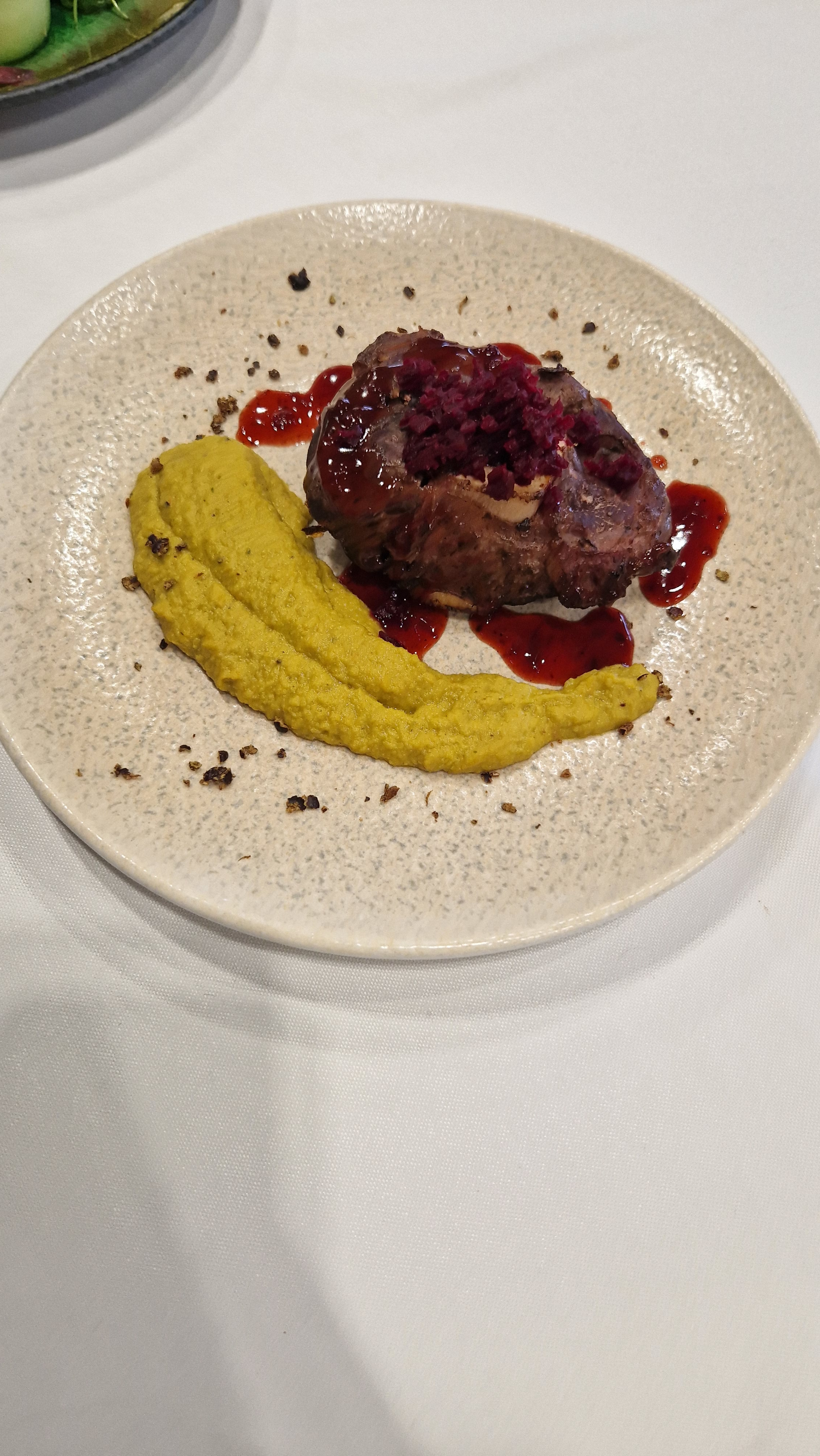 - Оссобуко лося с хумусом из овощей и икрой свекольной ферментированной.