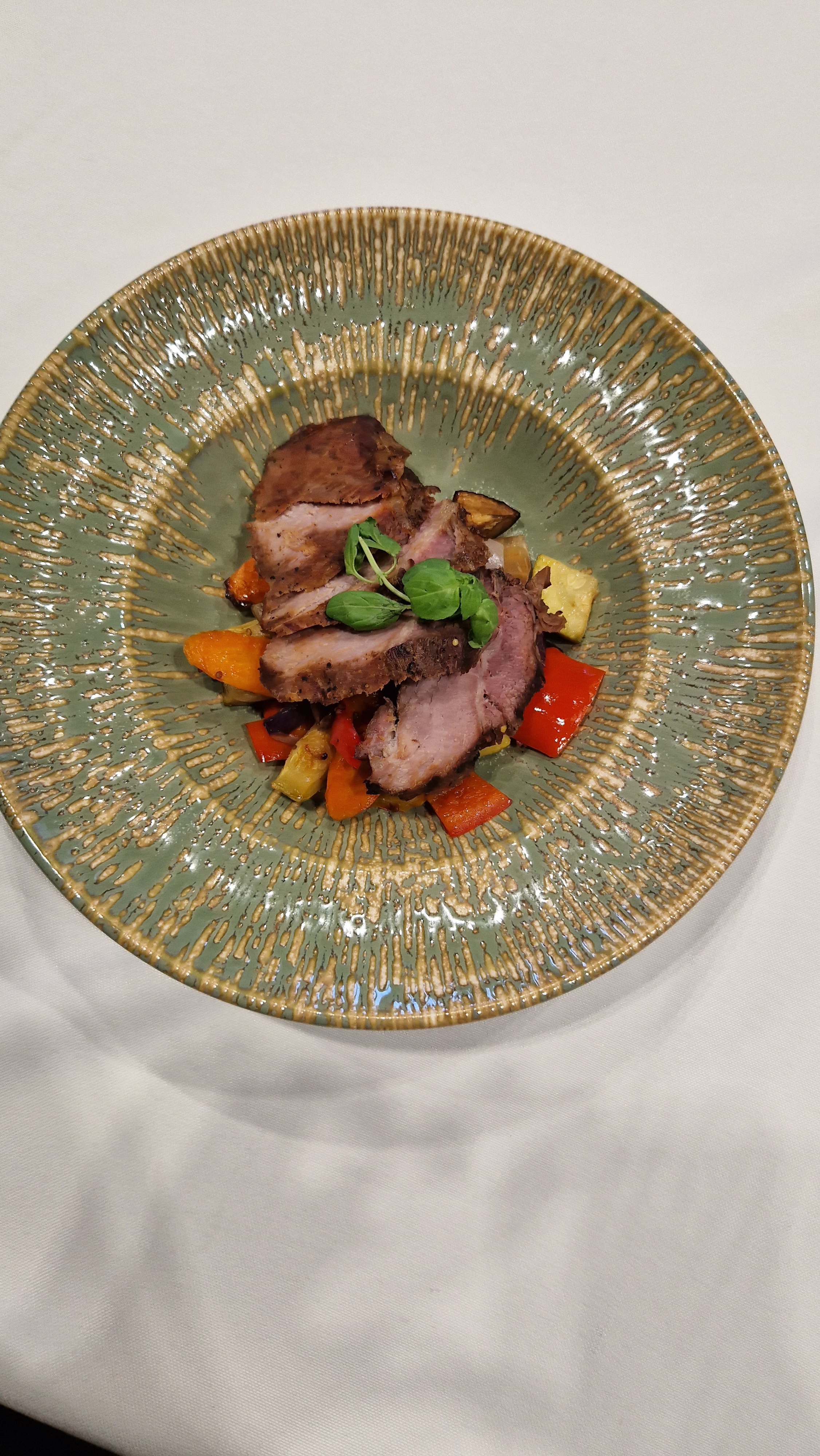 - Косуля с хумусом , икрой из свеклы и овощами гриль