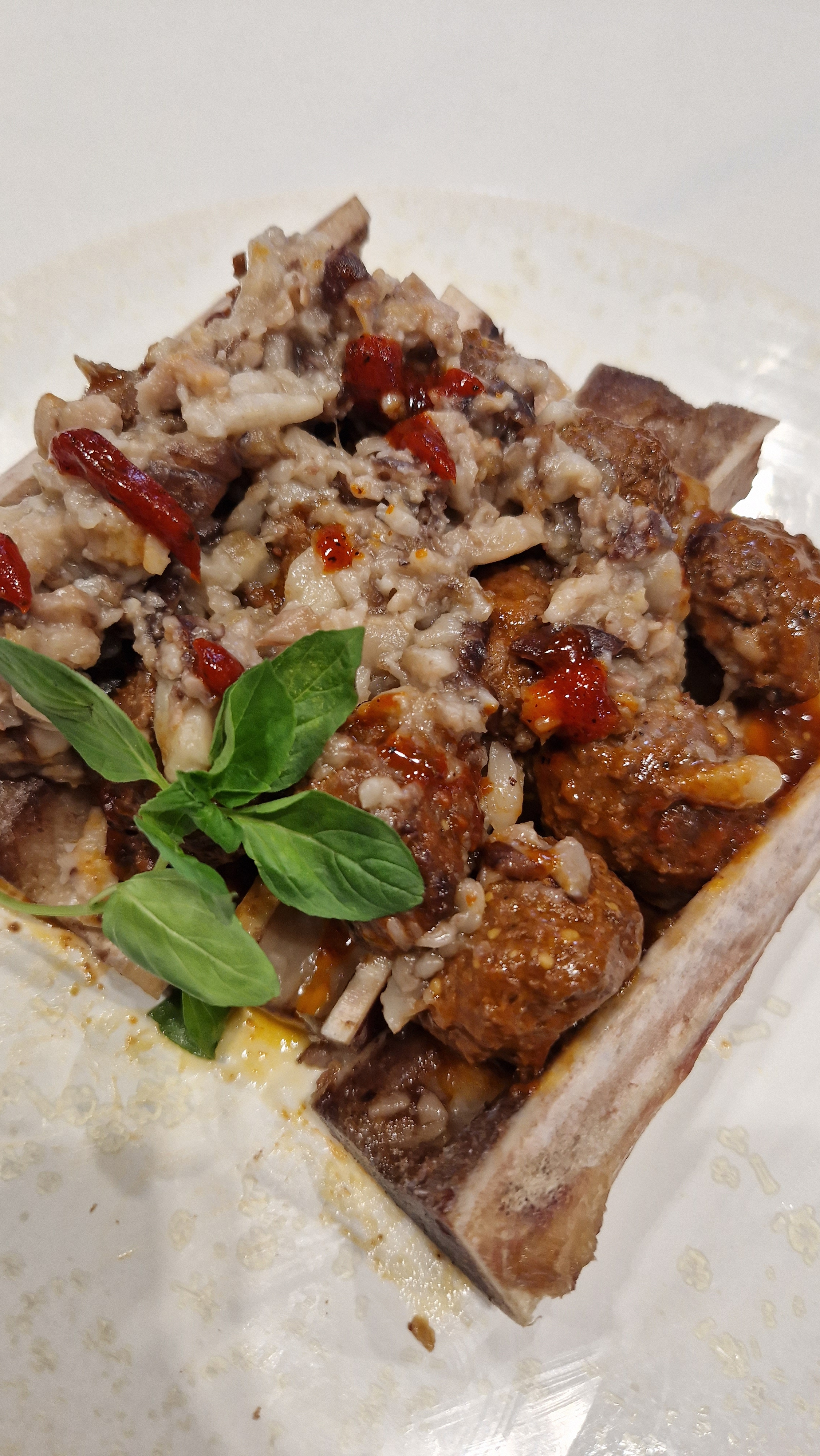 - Фрикадельки из фарша лося с салом кабана в соусе итальянском , на костичке с запеченным мозгом