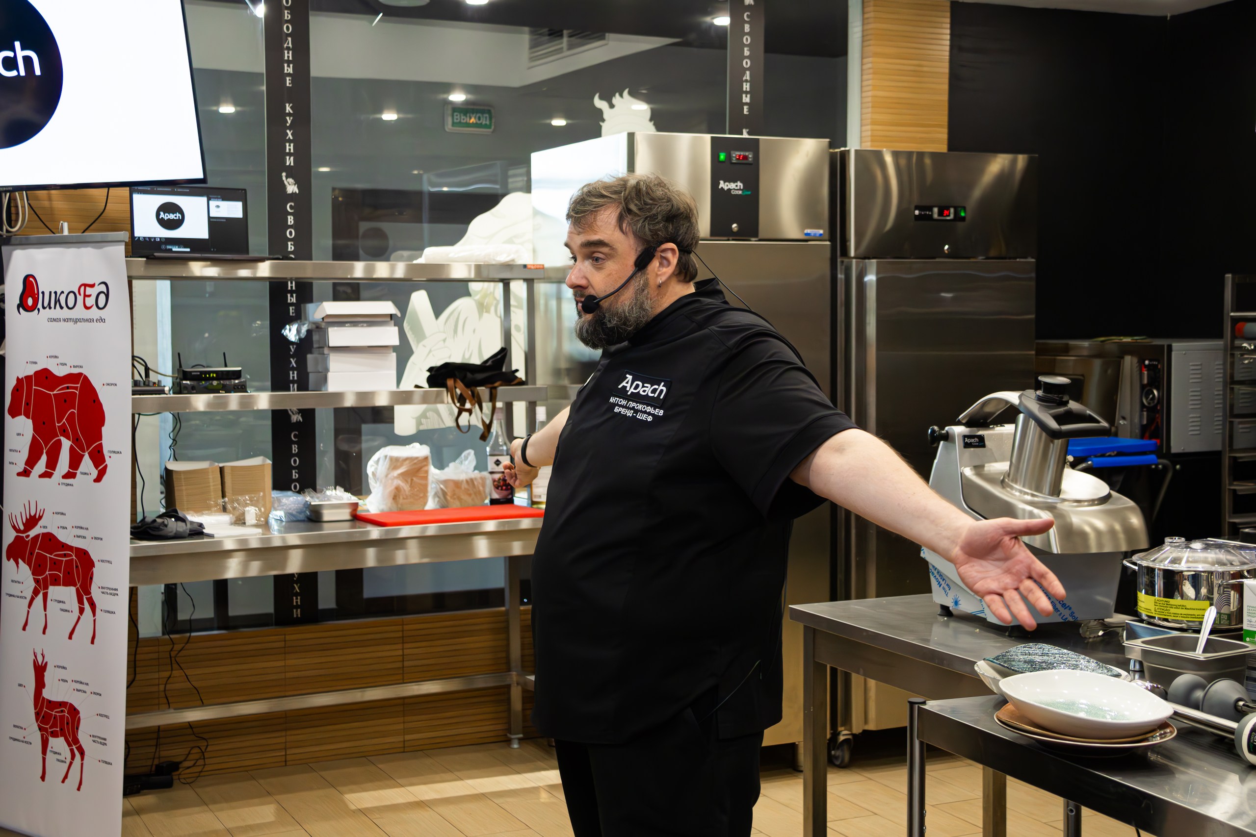 Шеф повара предложили участникам готовые решения по использованию дикого мяса в меню. Также на мастер-классе рассказали о технологии работы на оборудовании APACH. Каждый участник смог продегустировать готовые блюда.
