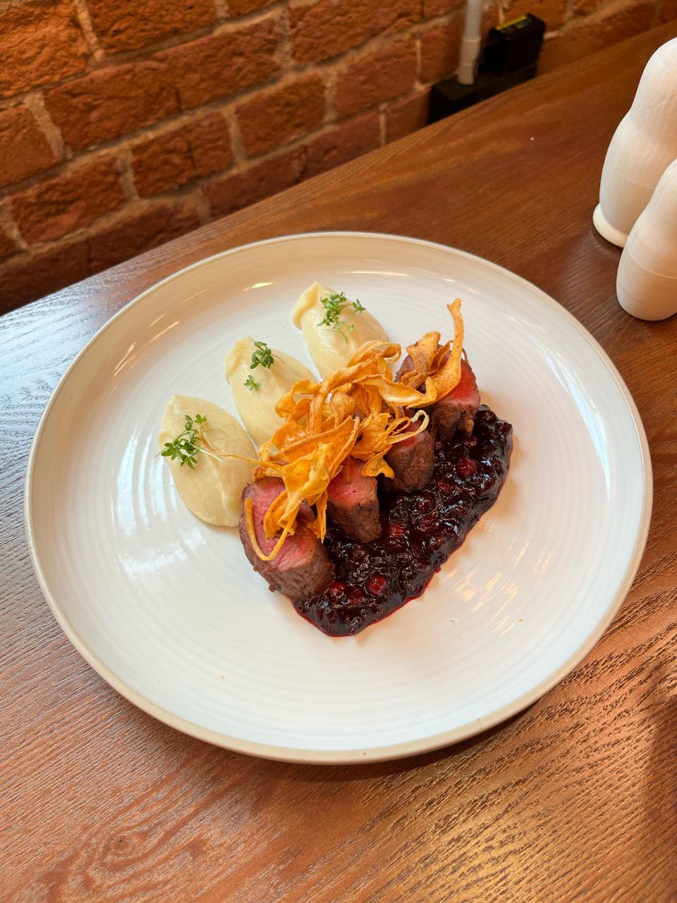 - Филе оленины в можжевеловом маринаде с пюре из тапинамбура и соусом из лесных ягод;