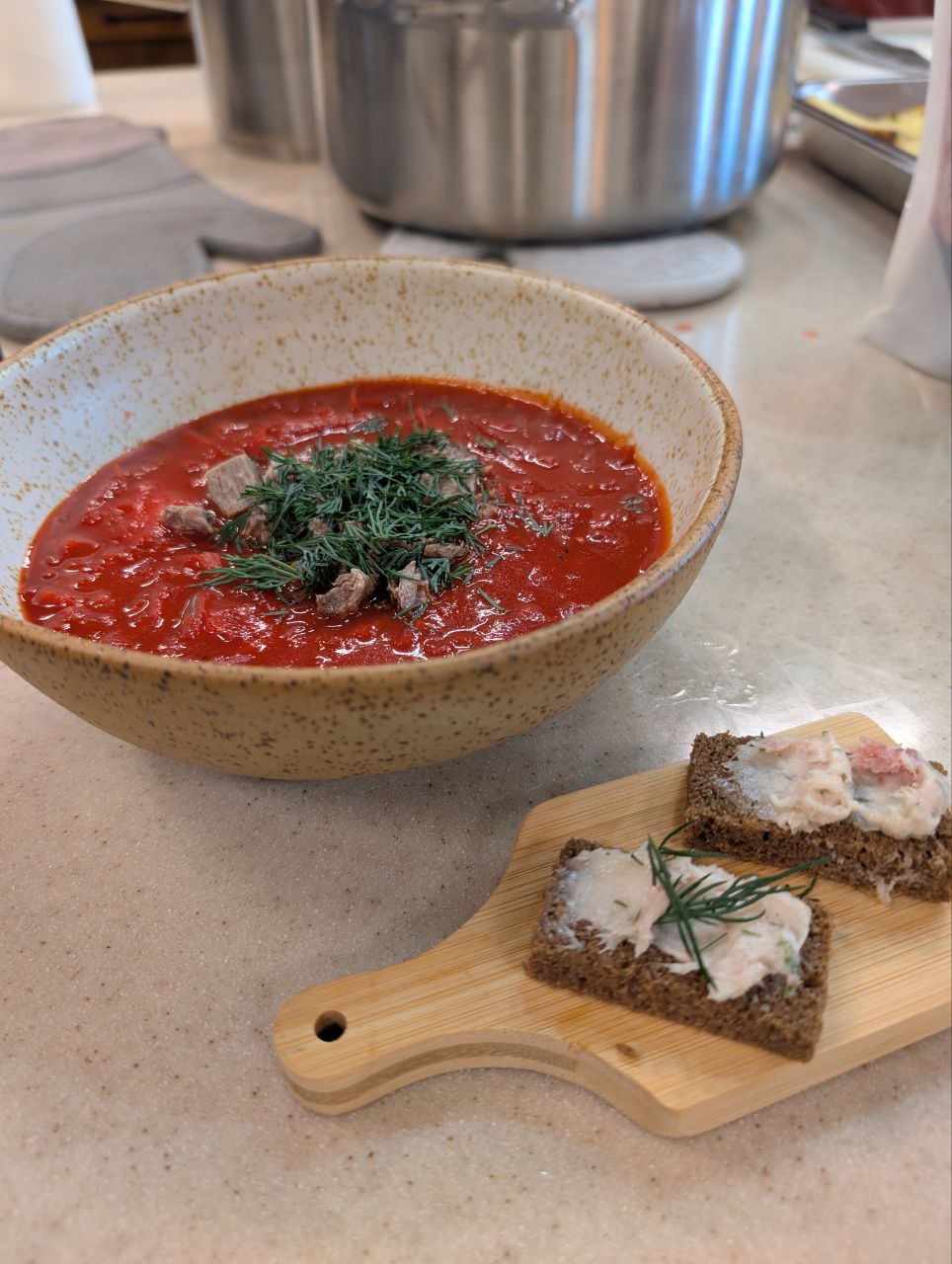 - Борщ с мясом дичи(кабана) с салом кабана;