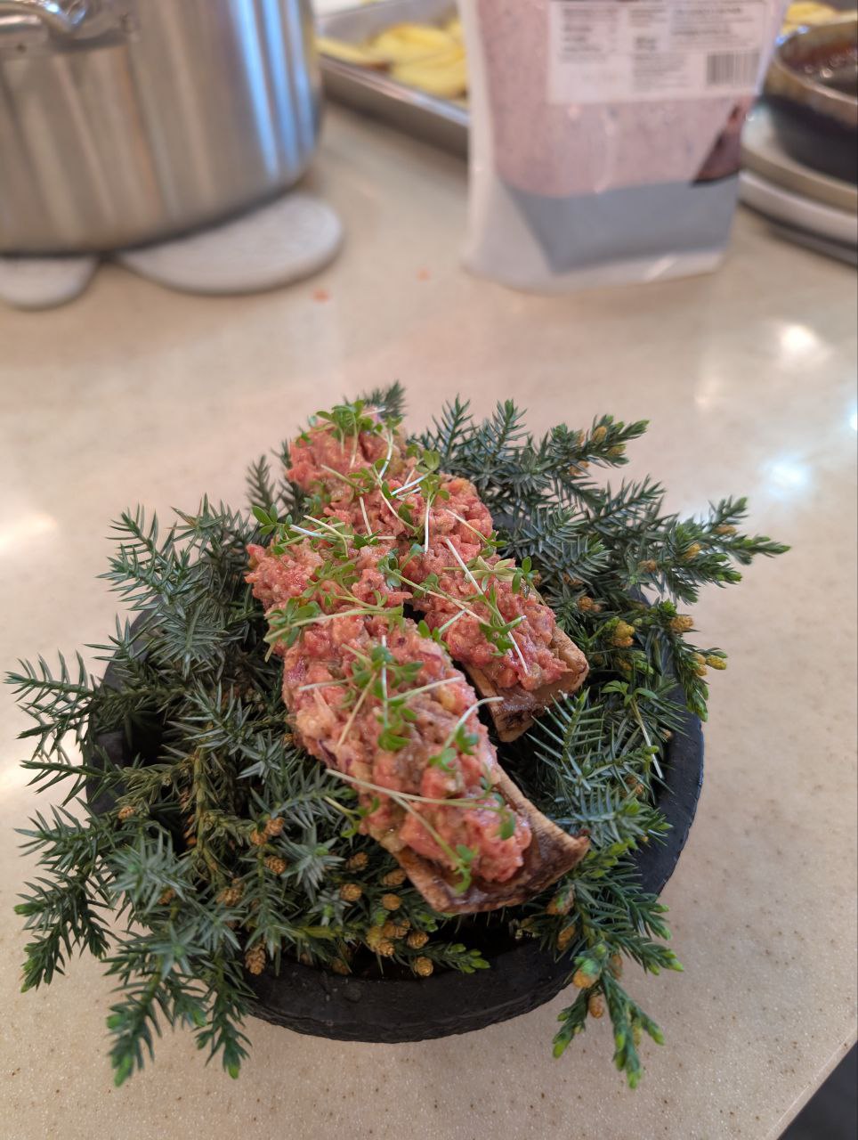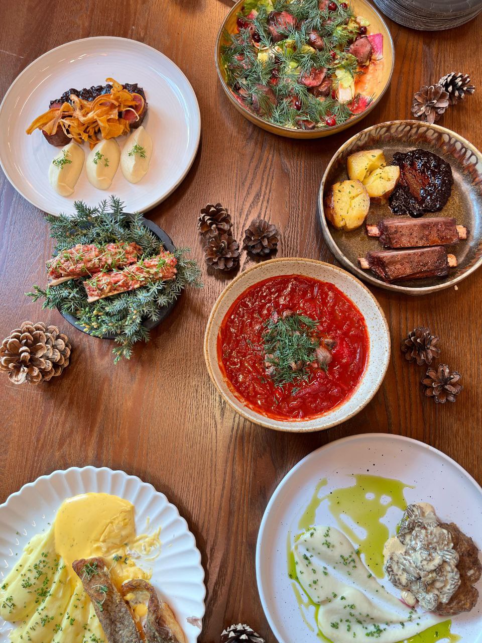 - Тартар из оленины на мозговой косточке конины;