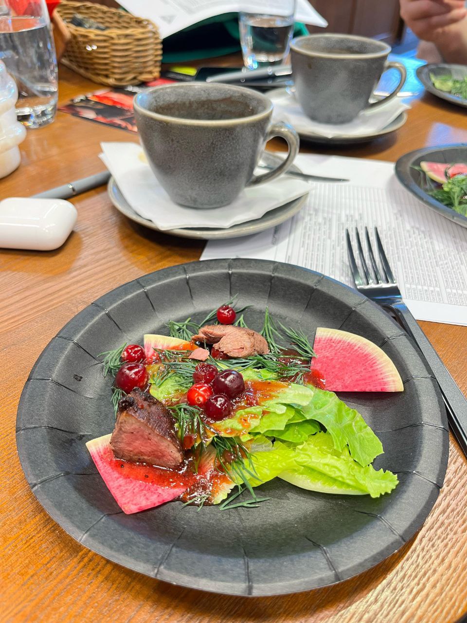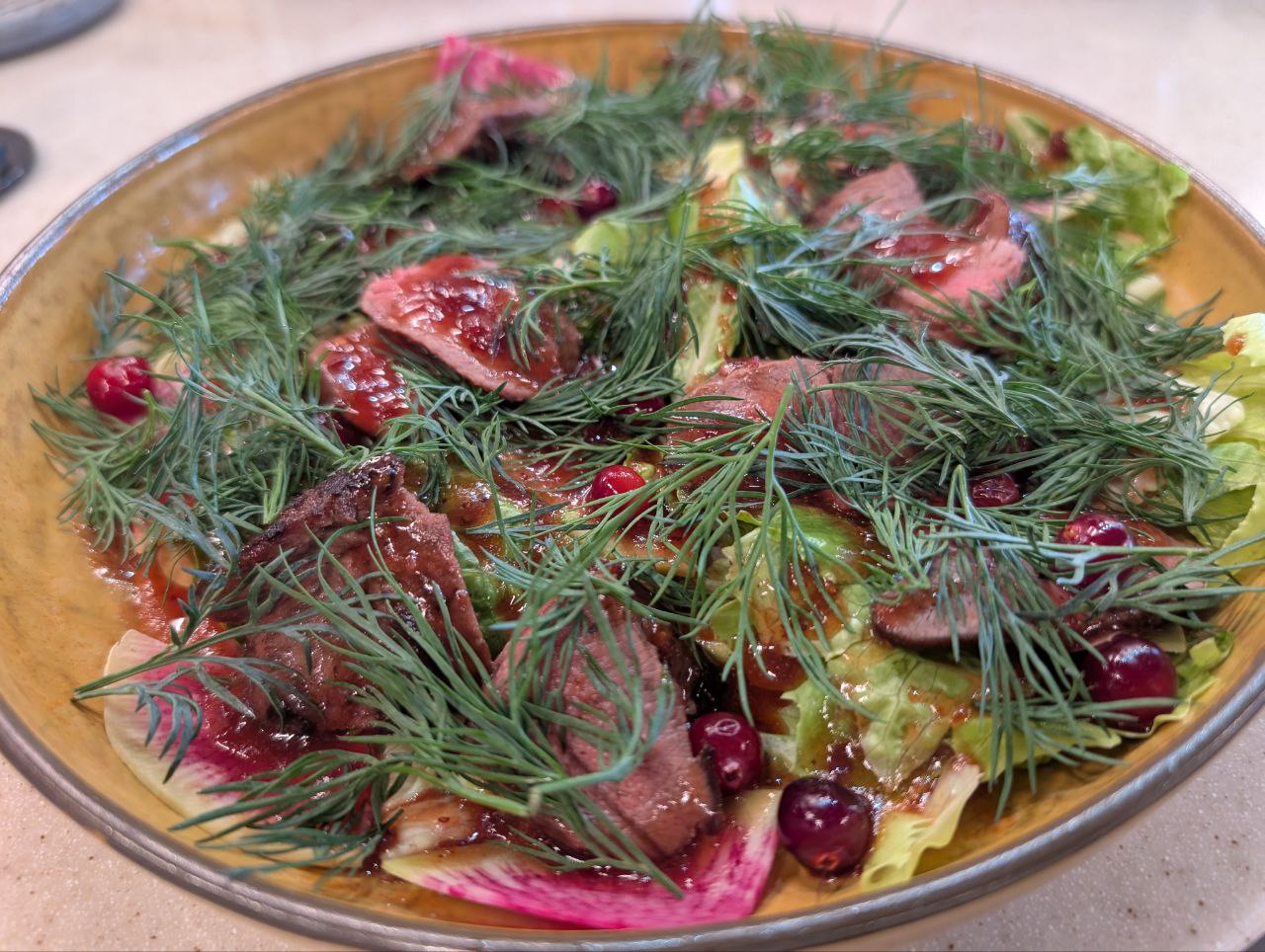 - Салат с мясом косули на гриле, клюквой и брусничным соусом;