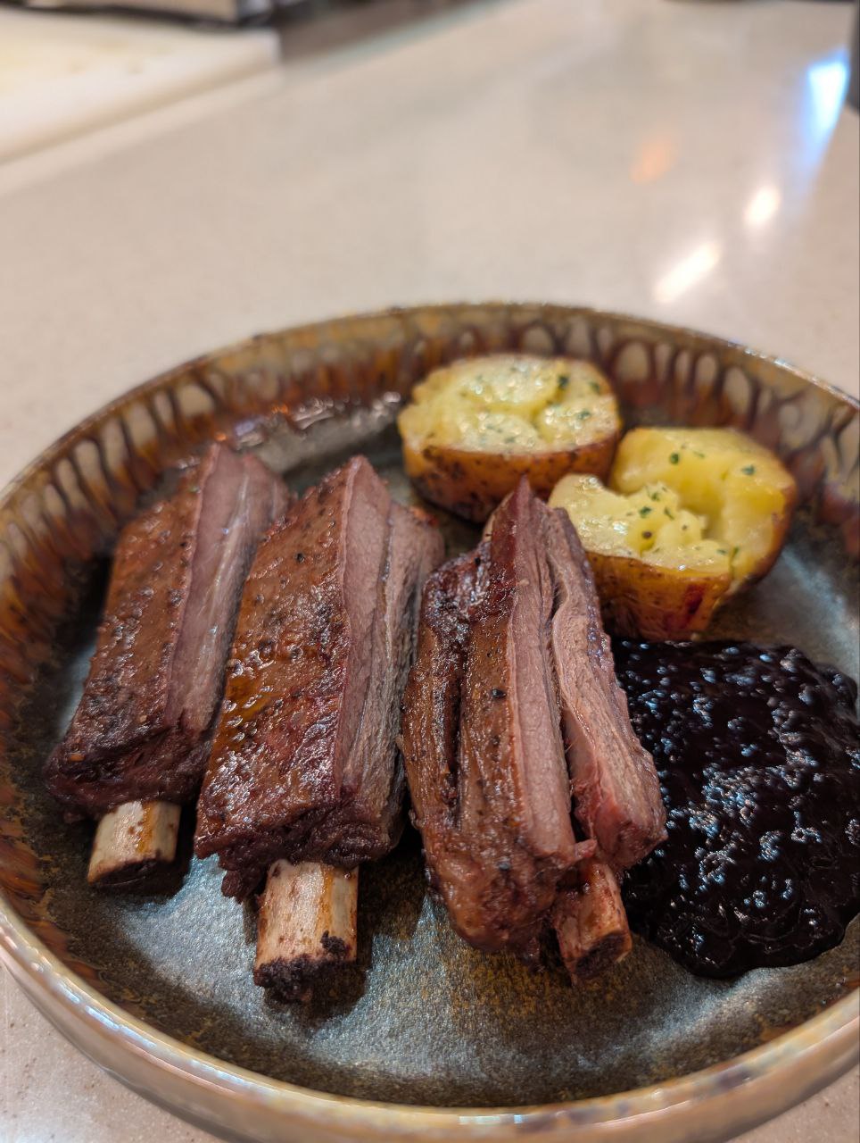- Томленные ребра морала с печеным яблоком и джемом из жимолости;