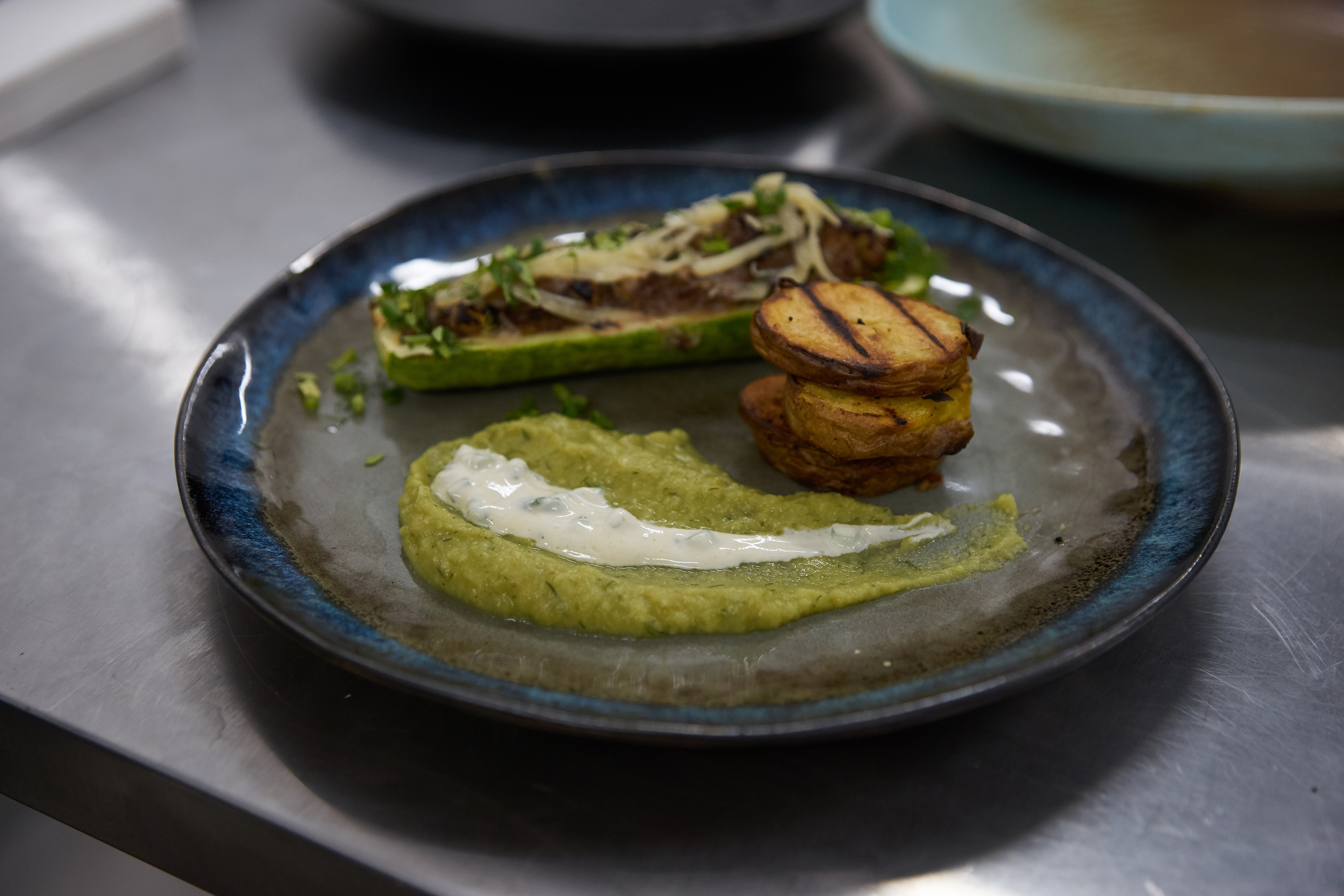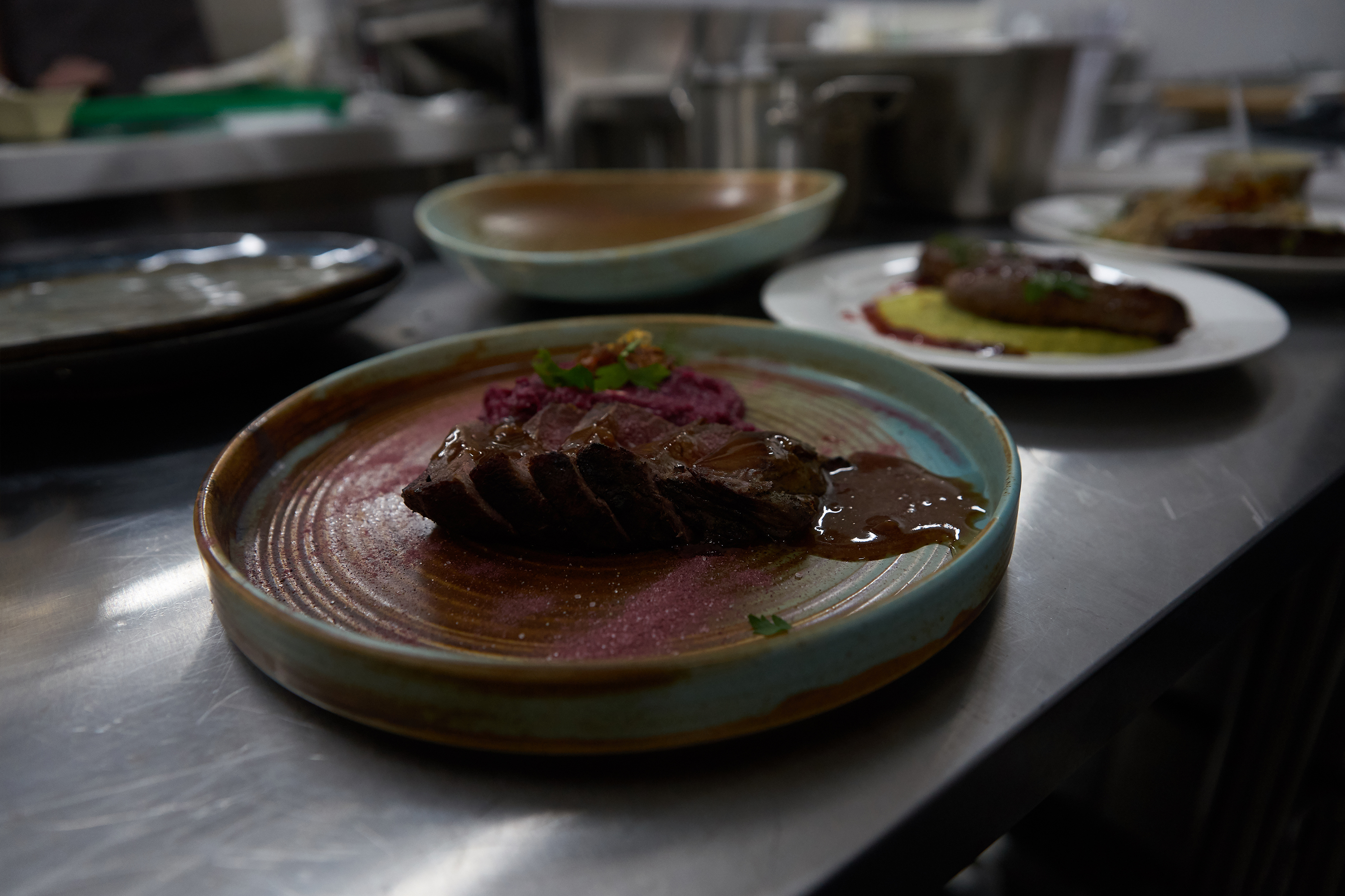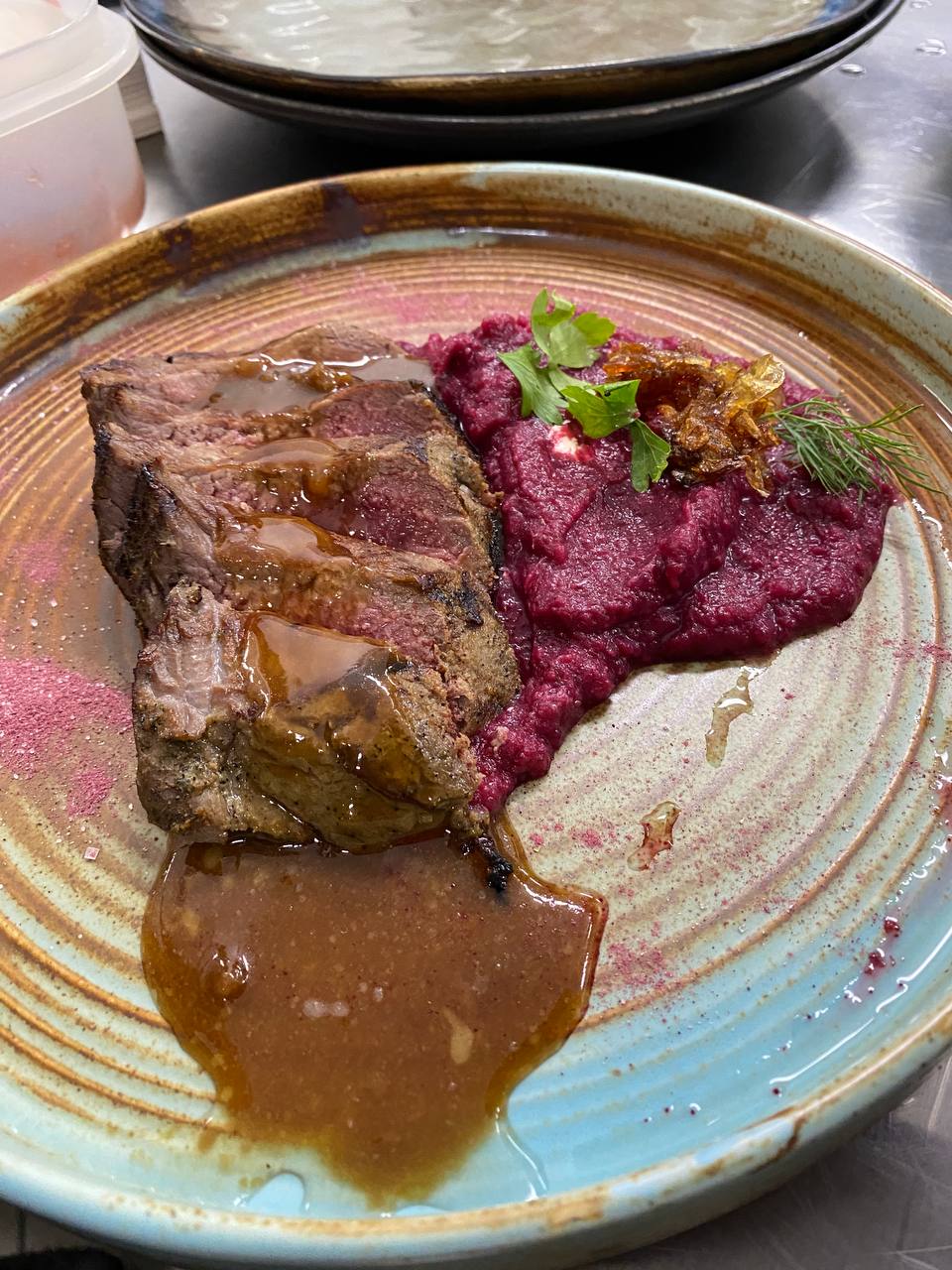 - Толстый край лосятины стейк свекольное гороховое пюре