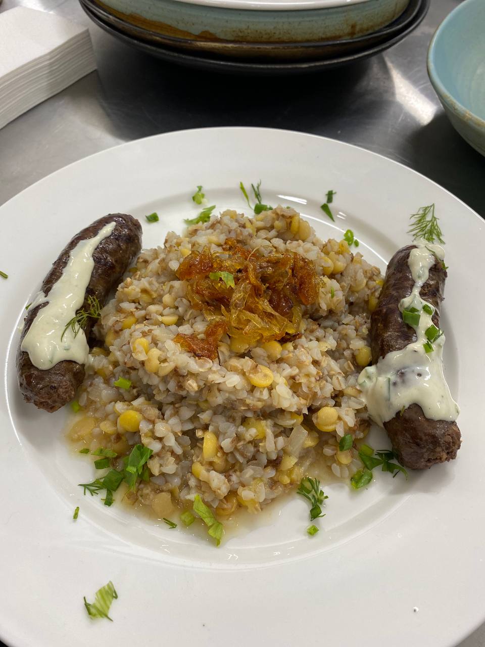- Колбаски из лося с гарниром каша Тихвинская