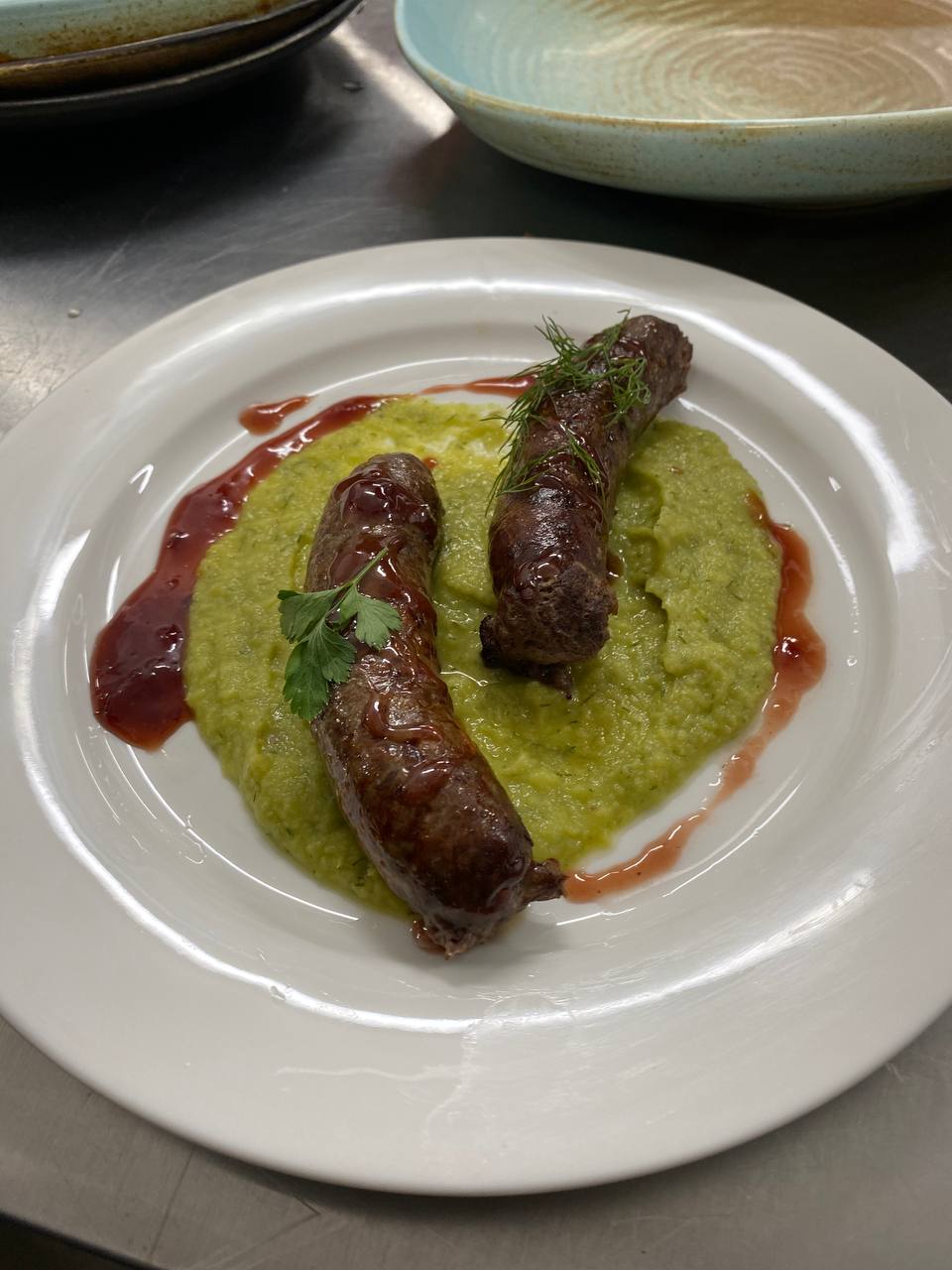 - Колбаски из оленя с гарниром свекольное/ гороховое пюре