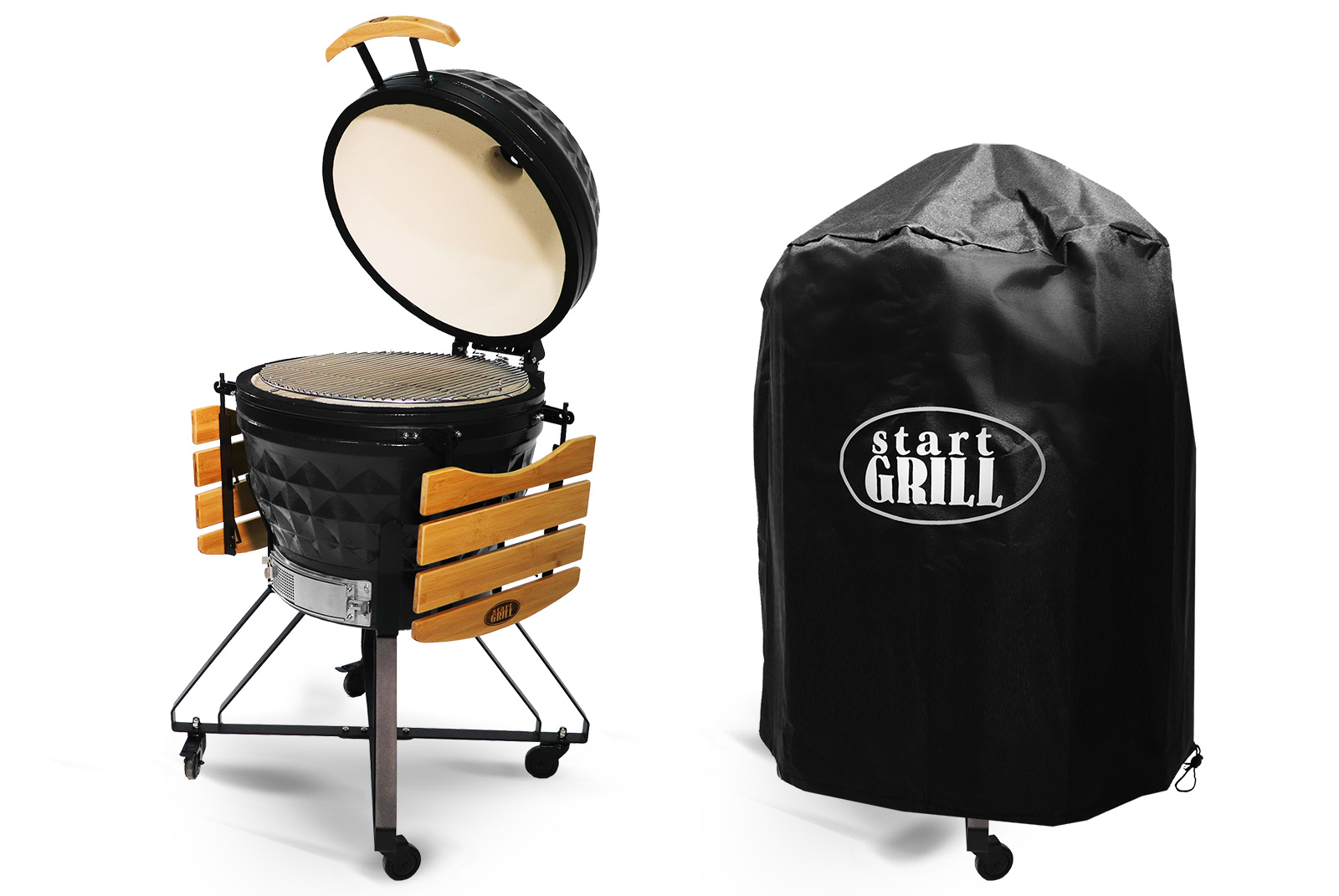 Этот керамический гриль больших размеров: вес его – 115 килограммов, габариты – 610 на 755 миллиметров. Диаметр жарочной поверхности соответствует увеличенным объёмам конструкции и составляет 525 миллиметров. Модель замечательно подходит для домашнего использования и отлично справляется с поставленной задачей приготовления большого количества блюд из мяса, рыбы и овощей. Несмотря на внушительный вес прибора, переставить его с одного места на другое не составит труда, благодаря оборудованию конструкции тележкой и колёсами. Утолщённые керамические стенки позволяют долгое время поддерживать необходимую температуру внутри аппарата, изменять которую можно легко и быстро. Термометр на крышке – прекрасный помощник, который значительно упростит приготовление вкусной и сочной пищи.