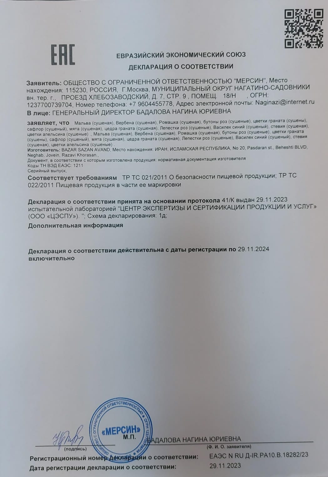 | Декларации и Сертификаты: | ЕАЭС N RU Д-IR.РА10.В.18282/23, срок действия до 29.11.2024 |